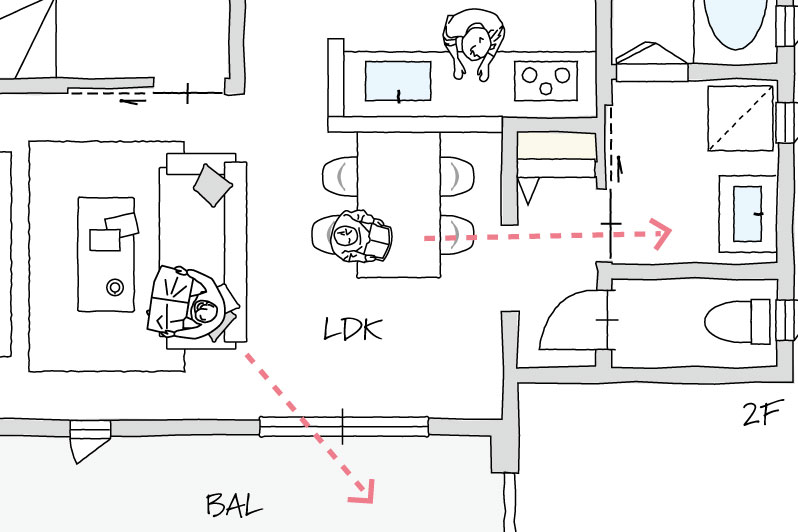 キッチンと水廻り、十分な広さを確保したバルコニーを2階に集約しました。リビングを家事動線の中心にすることで、自然と声がかけやすく料理も洗濯も家族みんなで協力し合える動線になっています。
