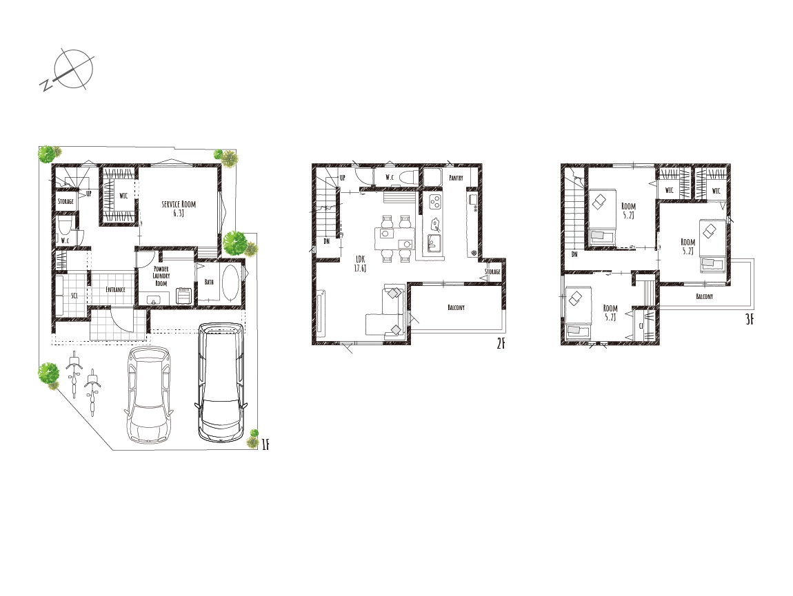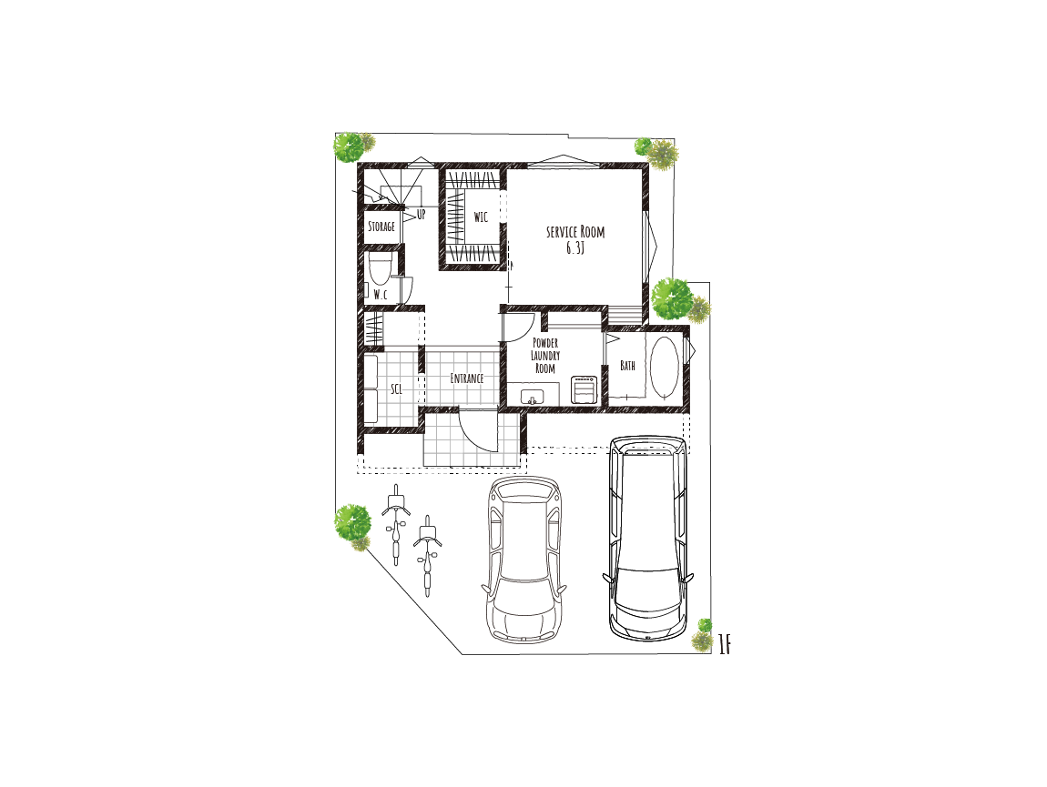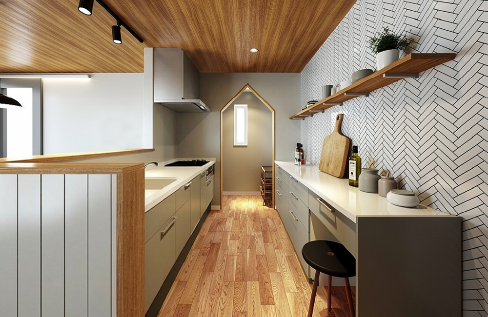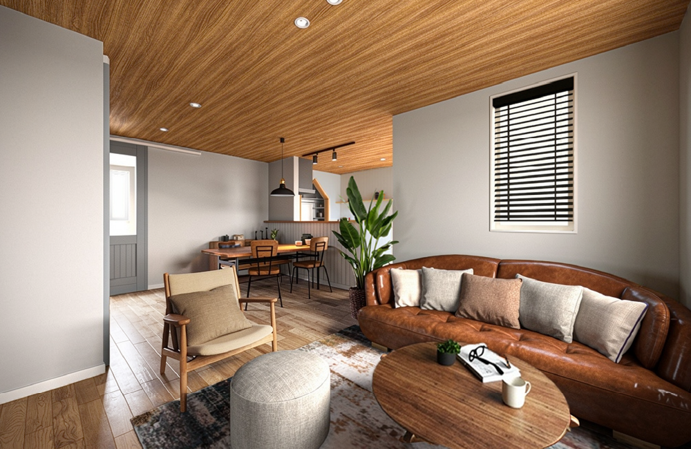 西海岸のやわらかな空気感と、明るさに包まれる心地よさを感じながら過ごせるお家です。二方向にひらけた角地に建ち、ゆとりある間口がもたらすのびやかな開放感も魅力のひとつ。外観は白をベースに木目とネイビーをほどよく効かせ、淡いブルーの扉がやさしく彩りを添えています。玄関やキッチンなどに採用した三角の垂れ壁や、さりげなく取り入れたヘリンボーン柄が、暮らしにほどよいリズムをプラス。LDKは南西の二面に開口部を設け、やわらかな陽ざしと広がりを感じながら心地よく過ごせます。天井いっぱいに広がる木目のクロスが空間にのびやかさをもたらし、ブルーグレーオーク柄の建具がやさしくなじみ、ゆったりとした中にも軽やかな心地よさを感じられる空間に。家族で過ごす時間も、自分らしく動ける時間も楽しめる住まいです。