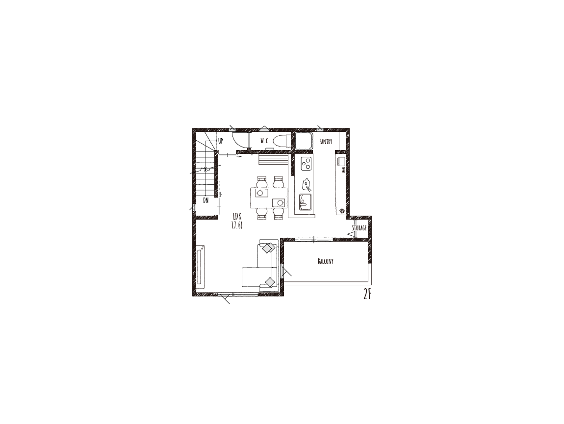 南側と西側に開口部を設けた、明るさに包まれるリビングです。L字型のレイアウトにより、ダイニングやキッチンとはゆるやかに仕切られ、落ち着いて過ごせる空間に。くつろぐ場所と食事の場所を自然に分けながらも、距離が近いので会話もしやすく、家族のつながりをいつも身近に感じられます。