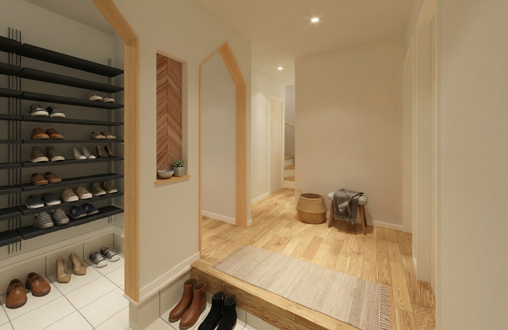 家族それぞれが使いやすい2WAY玄関です。三角の垂れ壁が印象的なシューズクローゼットを設け、来客と家族の動線をゆるやかに分けました。靴や汚れが気になるものもまとめて収納でき、ハンガーパイプには上着やバッグもかけられます。ヘリンボーン柄のニッチがさりげないポイントになっています。