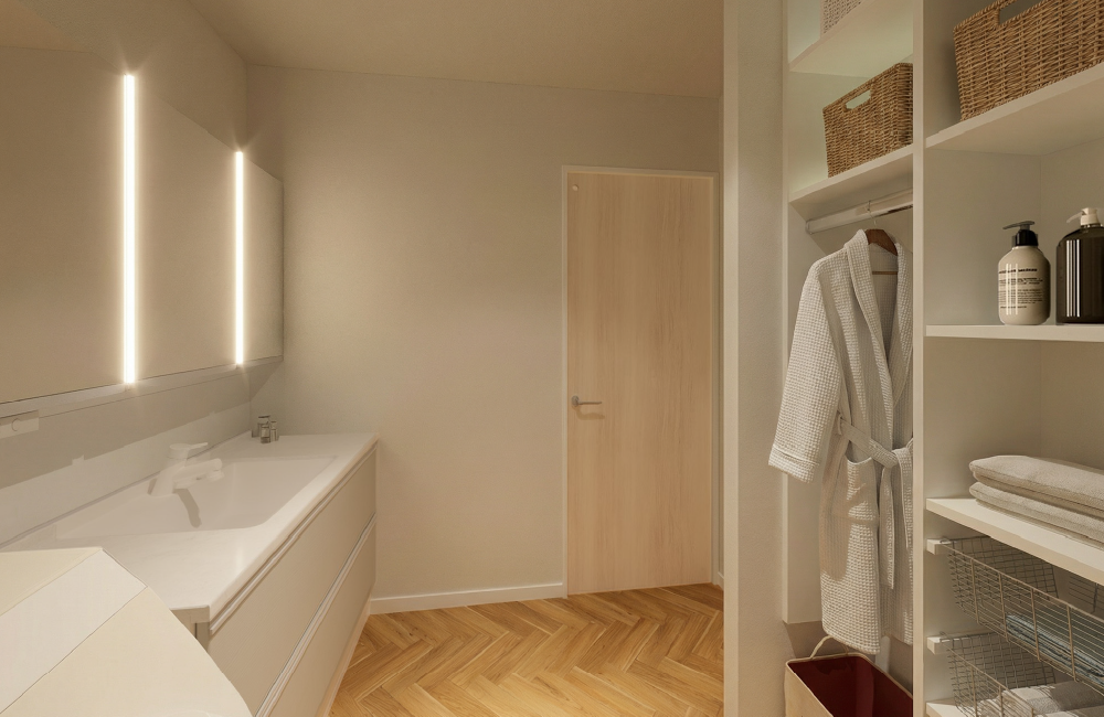 毎日気持ちよく使える、ゆとりある広さの洗面・脱衣室。可動棚や固定棚に加え、ハンガーパイプやバスケットを備えたシステム収納を設け、日用品や衣類をまとめて整理できます。洗面には幅1200mmのワイドな化粧台を採用し、三面鏡には顔全体を明るく照らすツインライン照明を取り入れています。
