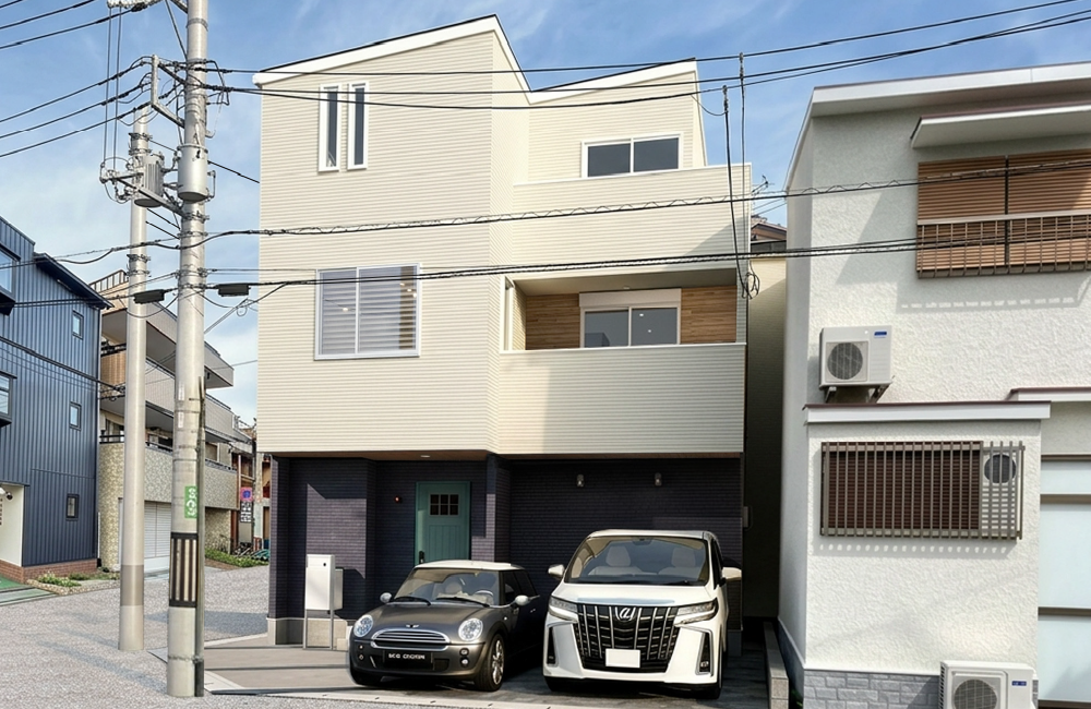 白をベースに木目とネイビーを取り入れた、やさしい雰囲気の外観です。角地に建つ立地とゆとりある間口が、のびやかな開放感を演出します。淡いブルーの扉がやさしく彩りを添えています。西海岸テイストを取り入れたデザインは、明るさとほどよい軽やかさが心地よく、街並みにも自然になじみます。
