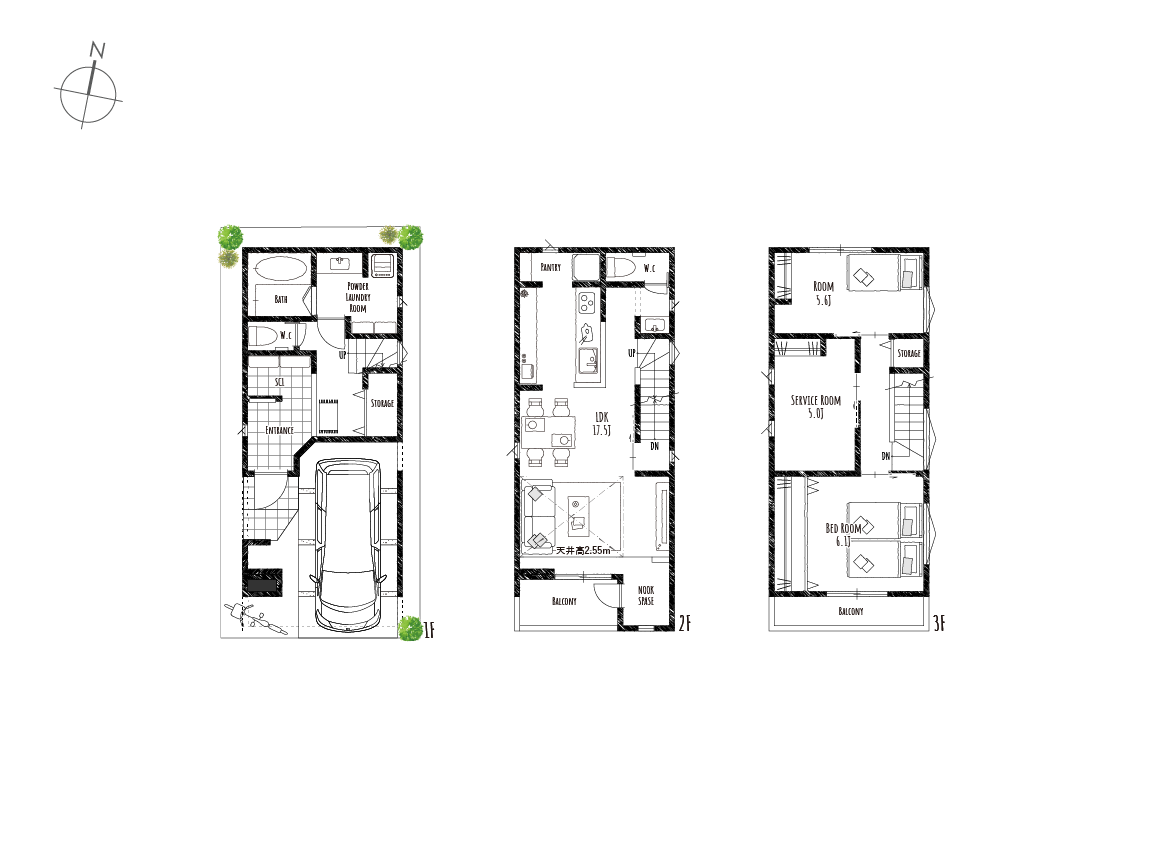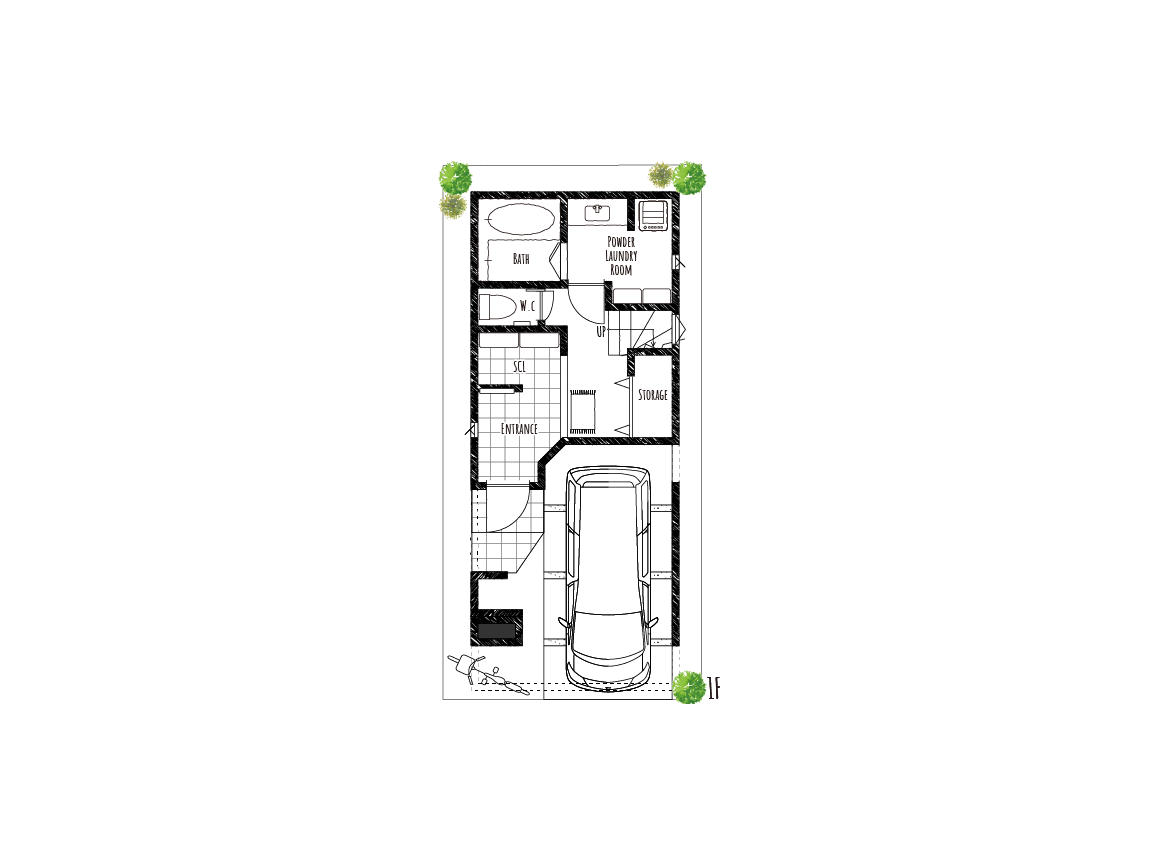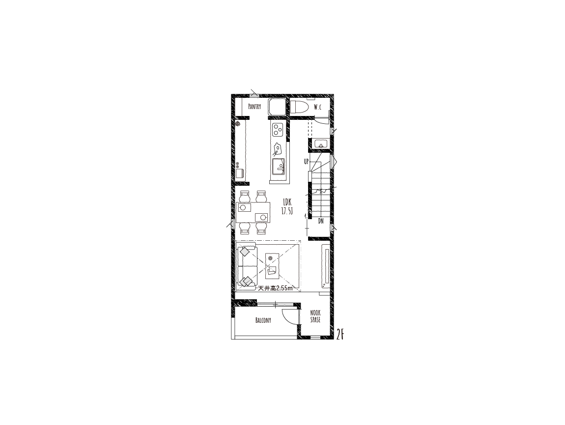 家族が自然と集まるリビングを中心に、心地よい距離感で暮らしを楽しめるお家です。リビングの隣には小上がりのスペースを設け、腰を掛けて過ごしながら、ソファでくつろぐ家族と気軽に会話を楽しめます。子どもが遊ぶ様子を見守ったり、学校での出来事を聞いたりと、日常の中で無理なく家族の時間が生まれる間取りです。リビングは折り上げ天井を採用し、視線が上へ抜けることで縦にも横にも広がりを感じられる開放的な空間に。一方、キッチンは折り下げ天井で、気持ちを切り替えて料理に集中できる落ち着いた雰囲気です。小上がりの奥には、リビングとほどよい距離感でこもれるヌックを配置。本を読んだり、少し横になったりと、自分の時間も大切にできる住まいです。
