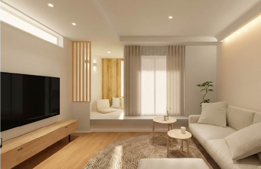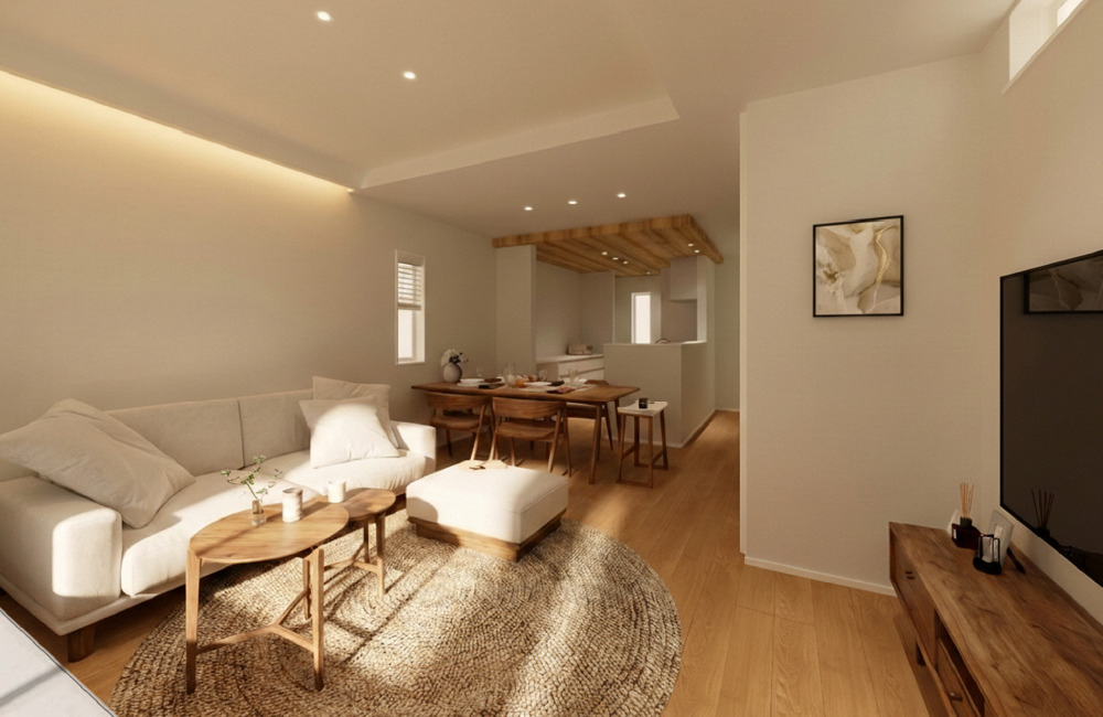 リビングは折り上げ天井により縦方向にも広がり、実際の広さ以上にゆとりを感じられる空間です。天井には間接照明を仕込み、昼はあたたかな陽光に包まれ、夜はやわらかな光がリビング全体を照らします。隣の小上がりに腰をかけながら、ソファでくつろぐご家族と自然に会話を楽しめるレイアウトです。