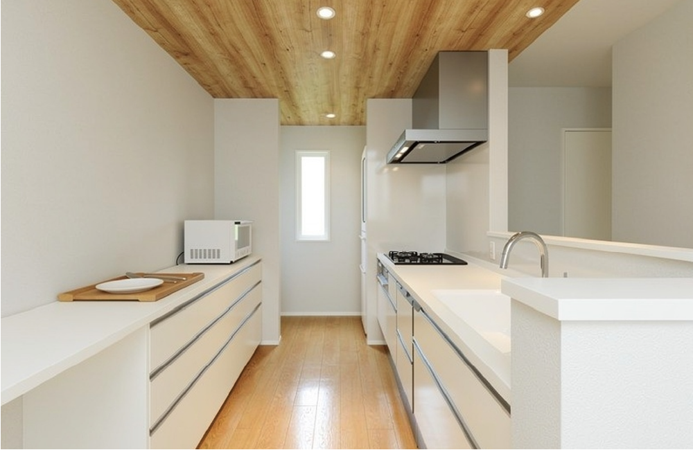 折り下げ天井を取り入れた、落ち着いて料理に集中できるキッチンです。奥には冷蔵庫もすっきり収まるパントリーを設け、生活感が出やすい家電やストック品をまとめて収納できます。ダイニングがすぐ隣にあるため、できたての料理をさっと運べて、配膳や後片付けも短い動線でラクに行えます。