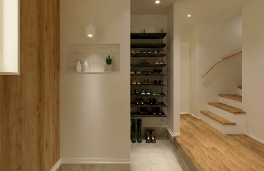 広い上り框を設けた、開放感のある玄関です。家族が並んで靴を脱ぎ履きできる広さがあり、朝の支度もスムーズです。奥は土間続きのシューズクローゼットになっていて、ベビーカーや外遊びの道具もそのまま収納できます。さらにホールには1帖分の物入を設け、日用品のストックも収納できます。