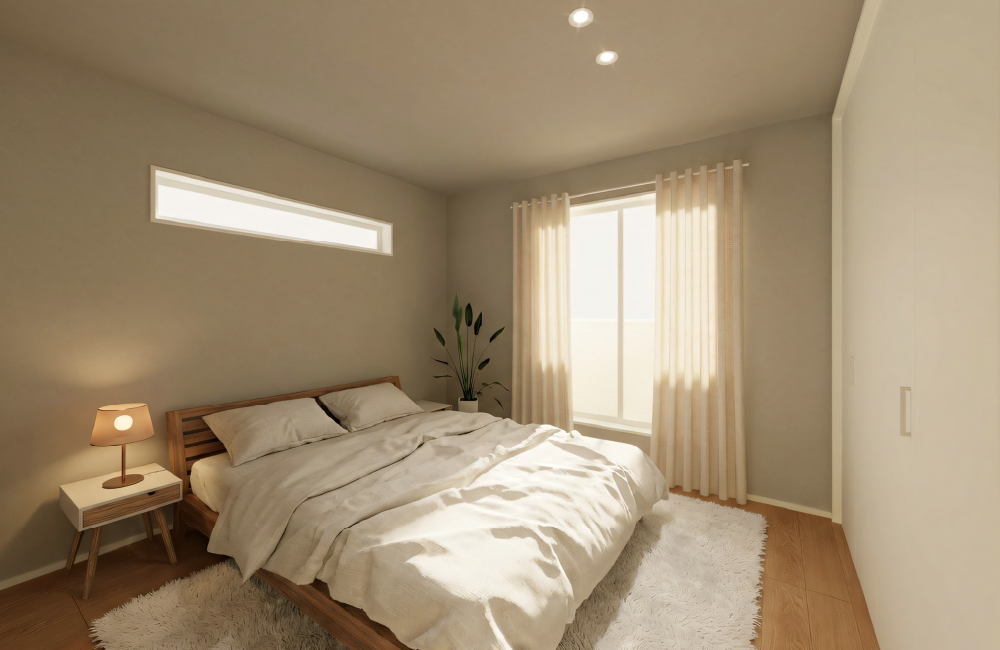 東向きのバルコニーに面した主寝室は、朝の光がやさしく広がる空間です。カーテンを開けるとやわらかな光が差し込み、一日を気持ちよく始められます。壁一面のワイドなクローゼットは、十分な収納力を確保しました。ご夫婦それぞれのスペースを分けて使え、衣類や小物までまとめて収納できます。