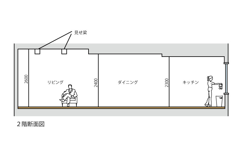 キッチン・ダイニング・リビングそれぞれの天井高に差をつけることで、空間にメリハリが生まれました。アクセントクロスと高低差でゆるくゾーニングし、食事をするダイニングとゆったりするリビングといった異なった空間を演出しました。また、天井を高くすることで窓から差し込んだ光が部屋の奥まで届くため、たくさんの自然光を取り入れたやさしい、リラックスできる空間になりました。