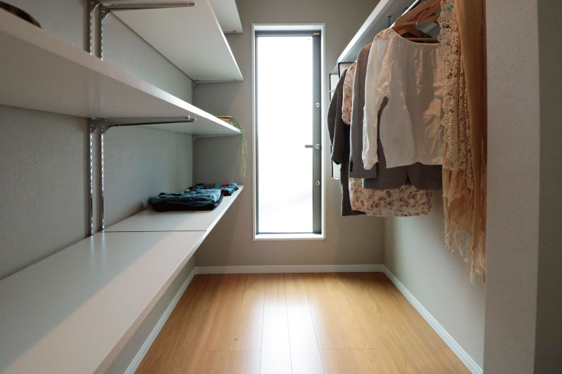 廊下からも、主寝室からも出入りできる3帖もある大容量のファミリークローゼット。バルコニーに直結しているので、干して直してがスムーズです。季節ものやスーツケースもまとめて収納できます。