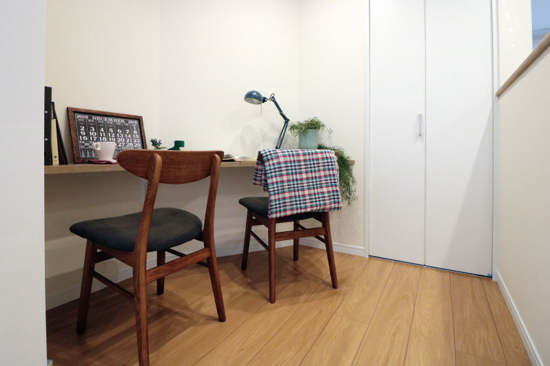 くの時に設けた、キッチンからも目が届く大きなスタディカウンター。建物形状を活かした造りで半個室のような空間になりました。リビングにいながらも集中できるテレワークスペースとしても◎