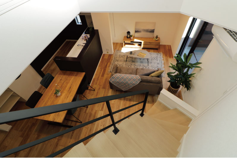 自然と顔をあわせることができるリビング階段と空間の広がりと家族の繋がりを生む吹抜けを採用。変形地を利用した三角形の吹抜けは、別のフロアで過ごしていても家族がどこにいるか気配を感じることができます。また、家族が集まるLDKに明るさと開放感が出るように、階段部分を壁ではなくアイアンの手すりにしました。
