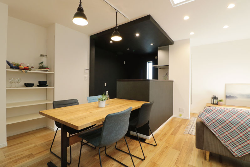 ダイニングがキッチンの横に来るように設計しました。回り込んでキッチンに行ったりダイニングテーブルに行ったりする必要がないので、料理の配膳も後片付けもスムーズです。子供をキッチン側に座らせれば、家事をしながら子供にご飯を食べさせることもできますね。