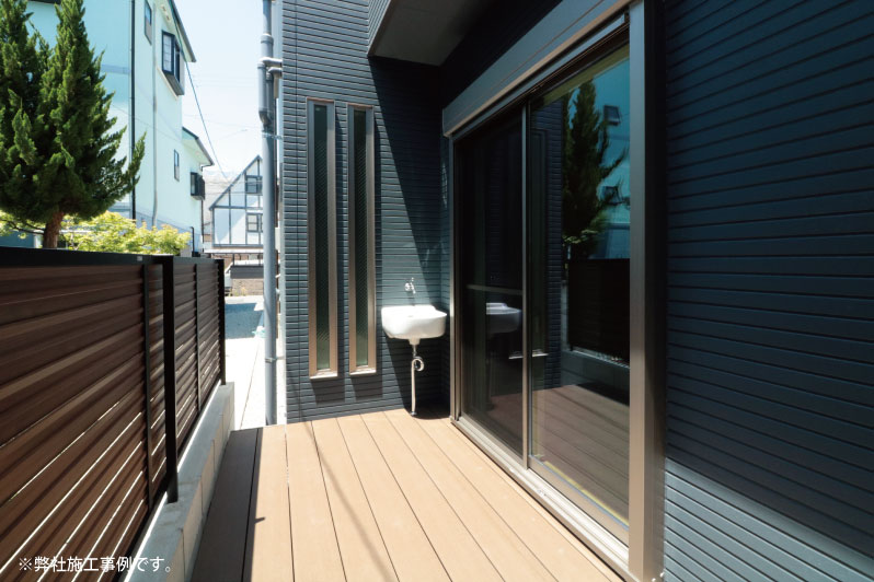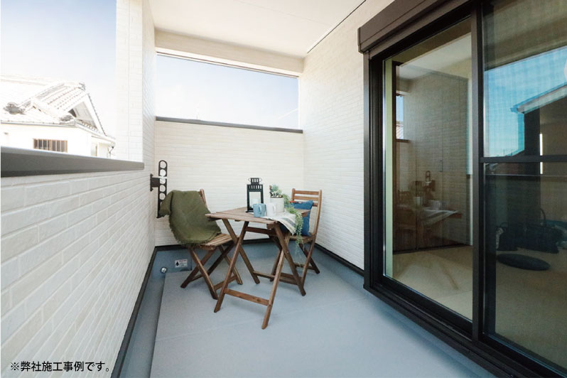 天候を気にせず洗濯物を干せるインナーバルコニー。突然の雨が降っても、外出時に急いで帰宅する必要もありません。主寝室の延長として、夫婦だけのプライベートな屋外空間としても。 ※写真は弊社施工事例です。