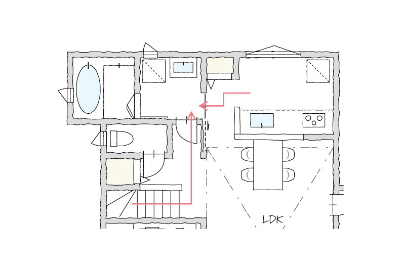 洗面室へはキッチンと廊下からの2WAYアクセスに。お料理、洗濯をしながらの“ながら家事動線”で時間短縮ができます。廊下からも入れるので来客があっても、リビングを通らずに洗面やお風呂に行くことができます。