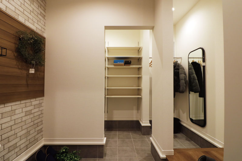 ベビーカーも楽に置ける広い玄関スペースは、誰がいつ来てもスッキリ片付いているお客様用と、お行儀悪く靴を脱いでいても大丈夫な家族用の2WAY仕様。アウトドア用品やコートなどなんでも収納できちゃいます。玄関の壁には羽目板を使いました。ラフな木目感がアウトドア用品の収納にぴったりです。