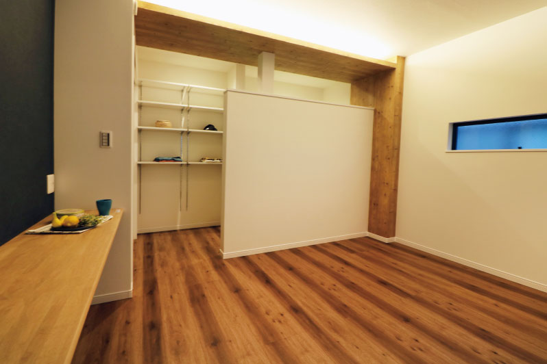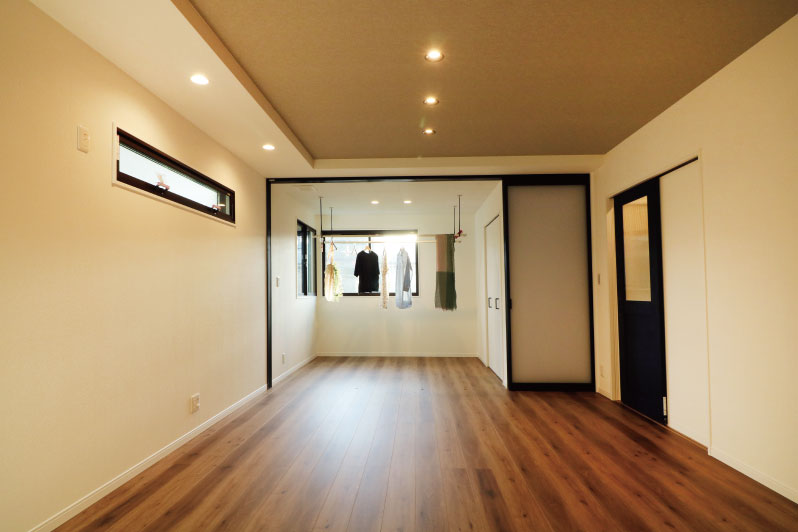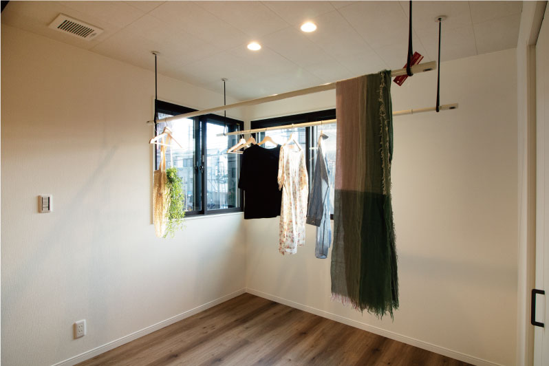 家族の暮らし方、成長に合わせて変化できるお部屋です。扉の開閉だけで、個室として、リビングの延長として使うことができます。天井空間を最大限に活用し、取り外しができる室内物干しを設けたので物干し専用のお部屋としても。