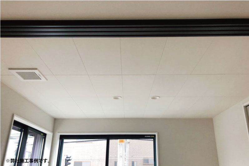 室内物干しを設けた天井には湿度を快適に調整してくれるパネル(MOISS)を使用しました。MOISSには調湿機能、有害物質の低減、消臭効果があるので洗濯物の嫌な匂いも軽減できます。また、換気扇も付けており、部屋干しのマイナスイメージを感じさせないように工夫しました。 ※写真は弊社施工例です。
