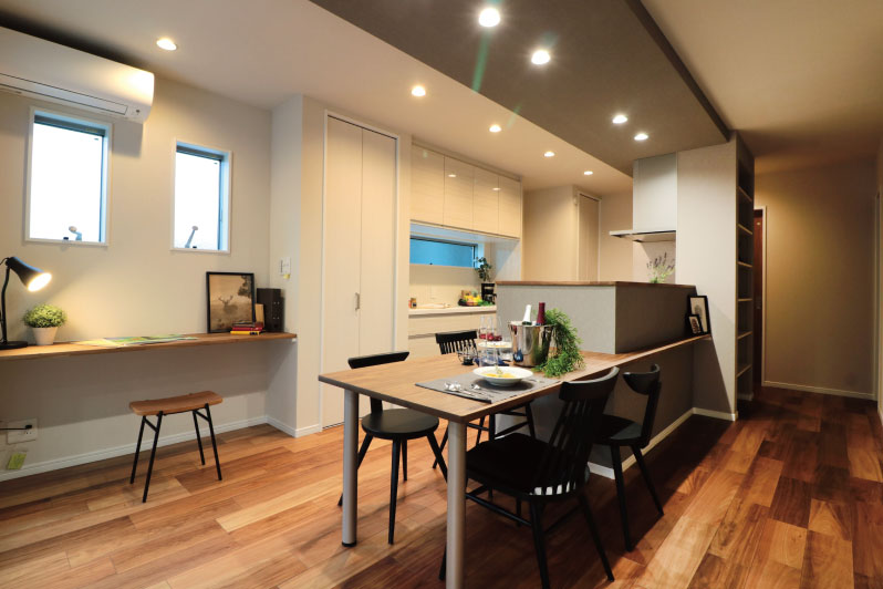 窓やダウンライトにシルバーグレーやプラチナ色を使い、深みのある穏やかな色合いのアカシアの床材と無垢材を組み合わせ、高級感ある落ち着いた空間があるお家になりました。ご家族の成長やライフスタイルに合わられる間取りの可変性や家事動線の考慮、キッチンとダイニングスペースの回遊、室内物干しができる洗面室など日々の暮らしも意識してプランニングしました。生活感を抑え、上品で落ち着きのあるスタイリッシュな暮らしのご提案です。