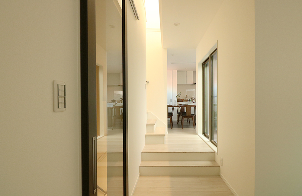 2階のLDK空間に広がりをプラスする、スキップフロアを取り入れました。リビングとダイニングキッチンを段差で仕切ることで、スペース同士が緩やかにつながり、縦の広がりにリズム感を生み、オシャレ空間を演出します。上部には吹抜けを設け、更なる開放感と明るさを建物の中に届けます。また夜間でも優しい灯りで足元を照らすフットライトが付いているので安全です。