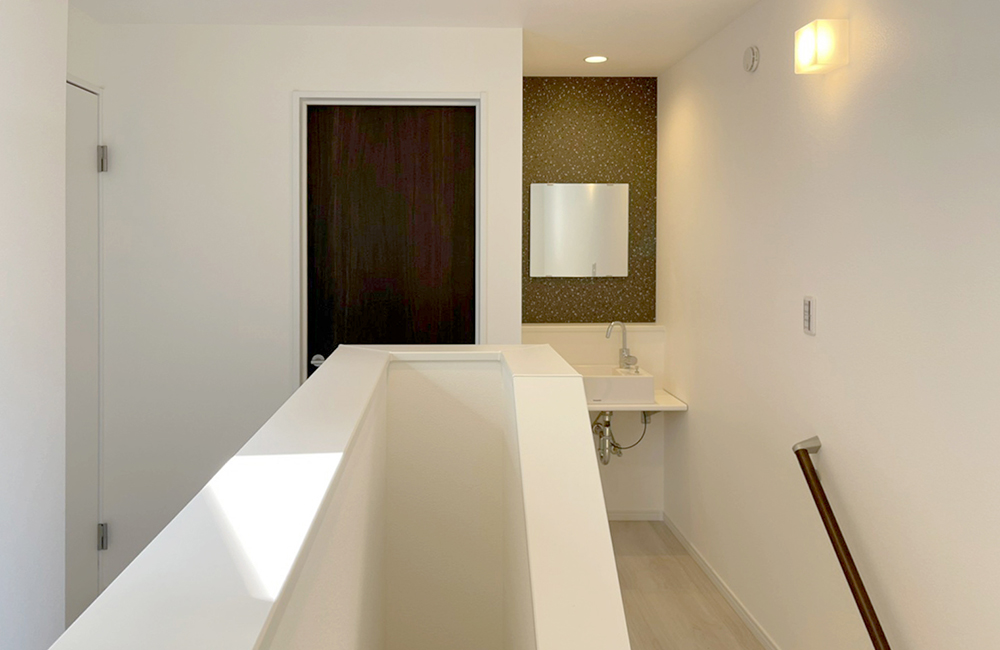 ご家族の寝室が集まる3階に、セカンド洗面とトイレを設けました。洗面台とトイレがあることで、3階の掃除や歯みがき、夜中にトイレに行く時など、わざわざ階段を登り降りする必要がなく、家の中の動線がよくなります。また通勤・通学時間が重なる、朝のあわただしい時間帯でも混雑を防ぐことができます。