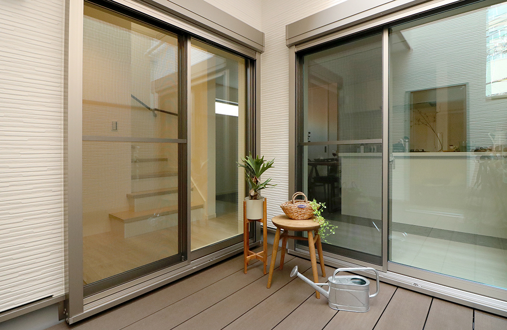 リビングとダイニングキッチンの間に設けた3.8帖の中庭バルコニーは、それぞれの空間の隅々まで届く、陽当たりを実現しました。バルコニーに室内と床高さを合わせるデッキを敷く事で、ダイニングキッチンとフラットにつながります。ランドリースペース以外にも、テーブルセットを置いてティータイムを楽しんだり、小さな子どもの遊び場など、フレキシブルにお使いいただけます。