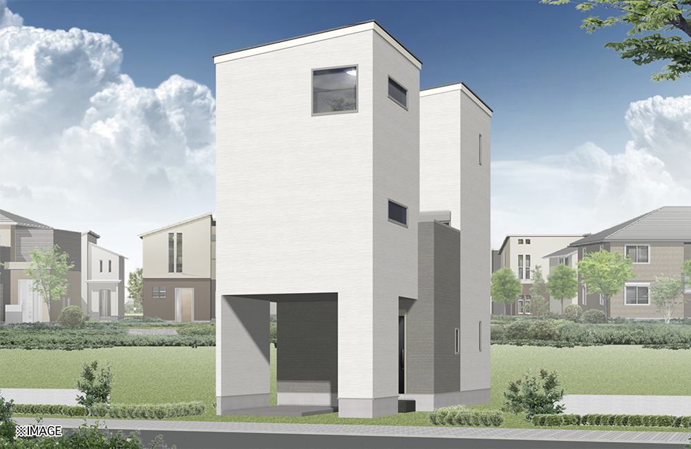 ホワイト×グレーの爽やかで都会的な暮らしにマッチするクールな印象のスタイリッシュモダンな外観に仕上げました。人目につく道路側は、プライバシー性を保ちながら、かっこ良く見えるように、窓の大きさや配置にもこだわりました。