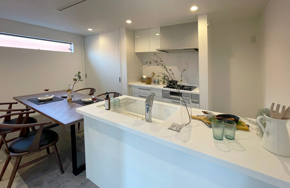 シンク台とコンロ台への距離が近く、使い勝手の良いⅡ型キッチンを採用しました。キッチンとダイニングテーブルを並べることで、スムーズに使える家事スペースになっています。アクセントフロアに石目柄の床材を使い、掃除もしやすく高級感のある空間を演出しました。またキッチンからは、バルコニー越しにリビングへ目が届くので、子どもが遊んでいても安心です。