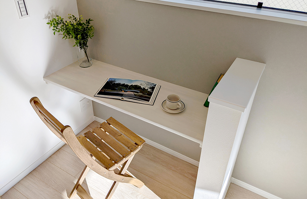 コロナ禍でのテレワークにも対応した、仕事と家事の両立をかなえるマルチカウンター。家事をしやすい位置にあるので動きやすく、リビングにいる子供の様子を感じながら、仕事にも集中できます。キッチンからも目が届くので、子供のスタディスペースとしても。