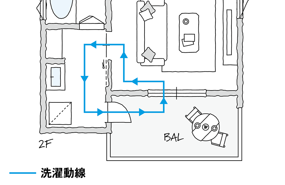 リビングとつながるカウンターキッチンに、2Fに水廻りをまとめ、毎日の洗濯時間を短縮できるLDK。バルコニーと直接つながる洗面室は、洗う→干すの毎日の動線がラクになります。また洗面室の収納棚は、タオルなどの日用品を使いやすい位置に整理でき便利にお使いいただけます。