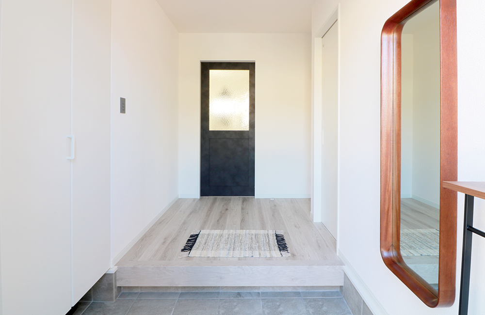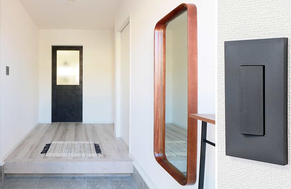 ホワイトのドアにホワイトオークの床で落ち着いた空間の中に、LDKのドアやキッチンの取手にはブラックを取り入れ、アクセントにタイル調のクロスを使いました。シンプルだけど存在感のあるグレーのスイッチや、あると嬉しい玄関に取り付けたミラーなど、日常の中でふと目に入る細かい場所にもこだわりました。暮らしを楽しく飾るアクセントがお家の中にちりばめられています。