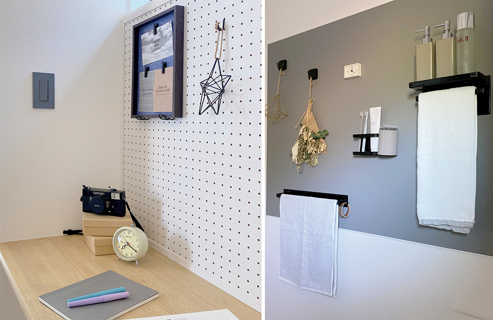 すぐに使える場所に収納したい…でも生活感は出したくないし、おしゃれに片付けたい。そんな願いを叶える「見せる収納」をお家の様々な場所に取り入れました。ママの趣味や、パパのお仕事、子供の勉強にも使用することができるダイニング横のカウンタースペースには有孔ボードを。フックを使用して、よく使う文房具や、本を読む時に使うメガネをかけておいたり。お気に入りの小物を飾るとリフレッシュした気持ちで作業に打ち込めます。洗面室に取り付けたアクセントボードはマグネット対応なので、壁を傷つけることなく用途に合わせて使用するものを簡単に変えることができます。いつも洗面台に置いている物も、まとめて壁面に収納できてスッキリきれい♪キッチンの腰壁にはマガジンラックを設けました。レシピ本などを収納することができます。散らかりがちな雑誌や新聞も収納場所を決めれば、お部屋がきれいに保てます。