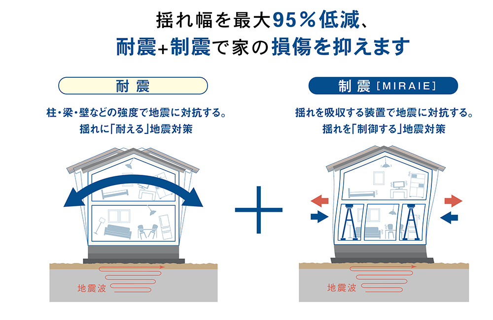 何気ない毎日を家族と楽しく快適に過ごしながら、もしもの災害にもしっかりとした備えを。大規模な地震への備えとして、耐震等級2を取得しました。また、地震の揺れを低減し、家の損傷を低減させる住宅用の制震ダンパー「MIRAIE」を採用しています。「MIRAIE」は、本震だけでなく、繰り返し来る余震にも効果を発揮します。耐震性能+制震性能で、家族の安全を守り、安心して過ごせるお家です。