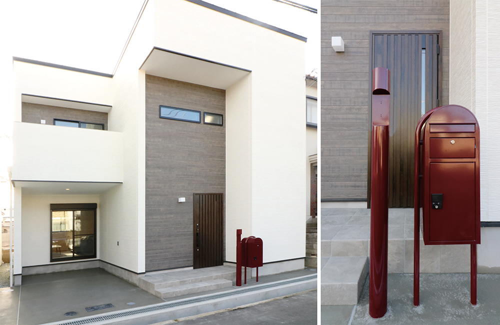 外壁のベースをホワイトの塗り壁調のサイディングに、アクセントとしてリアルな木目調のサイディングを使用し、スタイリッシュなデザインに仕上がりました。そこに、シンプルで飽きのこないフォルムが魅力的な、郵便ポストと門柱がお出迎えしてくれます。