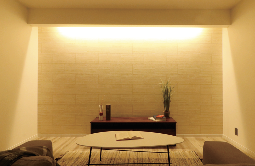 家族や仲間が集うリビングダイニングは、天井を2m50cmまで上げ、開放感のある空間に仕上げました。映画やドラマをみる時は全体の照明を消して、テレビボード背面に取り入れた間接照明のやわらかい光でリラックスできます。キッチン上は木目調の下がり天井でさりげなく空間を仕切り、LDK全体の雰囲気もおしゃれに演出します。