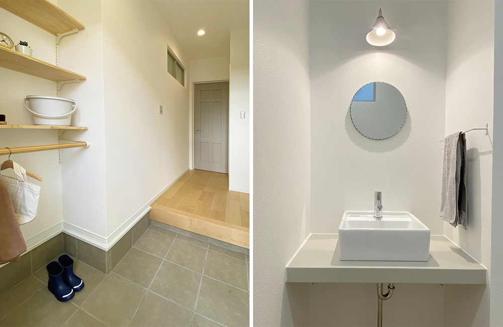 家に入って最初に目に入るスペースなので、細かな部分までデザインにこだわりました。やわらかな木目が人気のハードメープルの天然木を配し、帰宅時にすぐ手が洗え、実用的でおしゃれな洗面台や、ゆらぎ感のあるアンティークガラスの室内窓をアクセントとして設けました。また玄関とリビングとつなぐ室内窓や扉を、ソリッドカラーで塗装しました。玄関横に設置した無垢材の飾り棚は、自分好みのオリジナル収納を作ることができます。