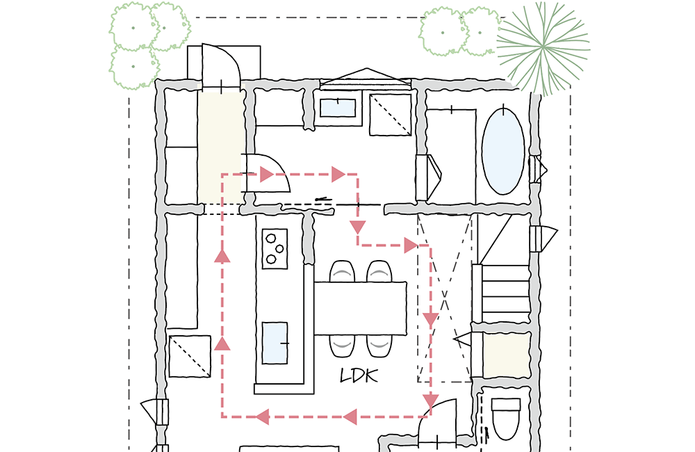 キッチンや洗面室の水まわりを回遊動線でつなぎ、効率的な家事動線を計画しました。キッチン横には、パントリーとして、まとめ買いした食品や飲料、調理器具をストックしておける以外にも、洗剤などの日用品置き場としても使える、大容量の収納部屋を設けました。また勝手口を付けることで、キッチンで料理の匂いが充満した時にサッと換気ができたり、一時的に生ゴミを外に出しておけたりと便利にお使い頂けます。