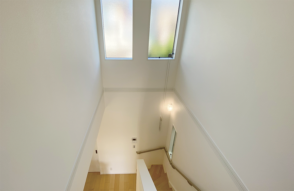 1階のLDKと、2階の居室をゆるくつないだ、吹抜けリビング階段を設けました。吹抜けの窓から光が差し込み、家全体が明るく開放感な空間です。外出時や帰宅時に必ずリビングを通るの、で家族が顔を合わせることが多くなります。また料理をしながらでも、2階で子供が遊んでいる気配を感じたり、「ご飯できたよ~!」と2階にいる家族に伝えることができ、自然と家族の距離を縮め、コミュニケーションが育めるよう工夫しました。