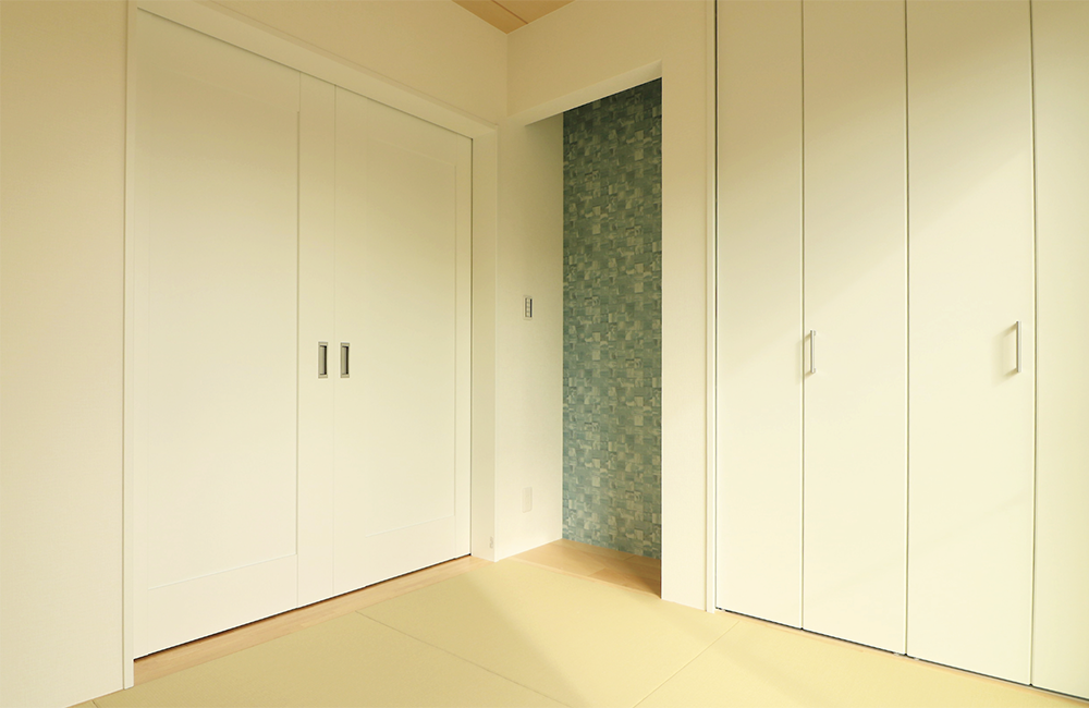 リビング横にはオシャレな琉球風畳の、フレキシブルに使える和室を設けました。ママの家事の合間に、ほっとひと息つける休憩スペースとして。子育て中には、小さなお子さまと遊んだり、お昼寝の場所としても活躍します。来客時には、フルオープンにするば、約20帖のリビング空間として使え、押入れから布団を出して扉を閉めれば、お客様の寝室としても使うことができます。
