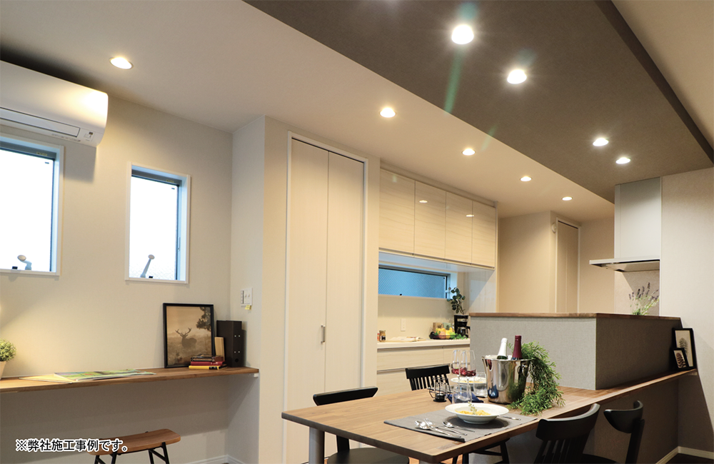 LDK全体の照明をダウンライトにしてスッキリとした空間に、下がり天井にはコーブ照明を取り入れました。家族が揃って食事をする時は、ダウンライトをつけて、しっかり明るさを確保しています。リビングでソファに座って映画をみたり、くつろぎの時間にはダウンライトを消して、コーブ照明のやわらかな光で落ち着いた空間に。様々な生活シーンに合わせてLDKの照明を選ぶことができます。