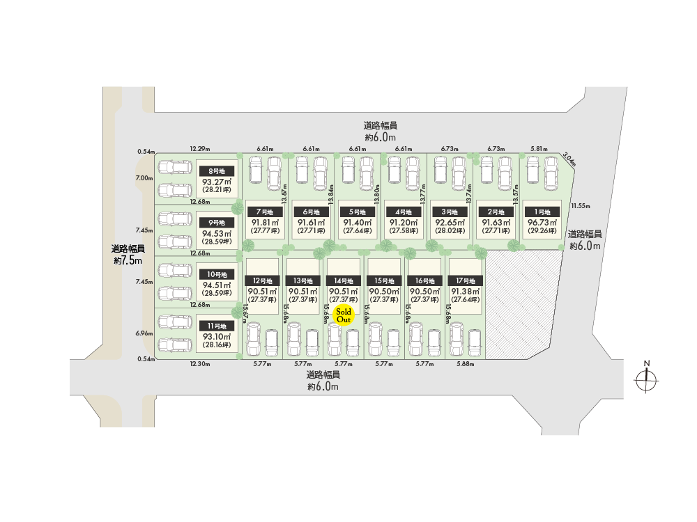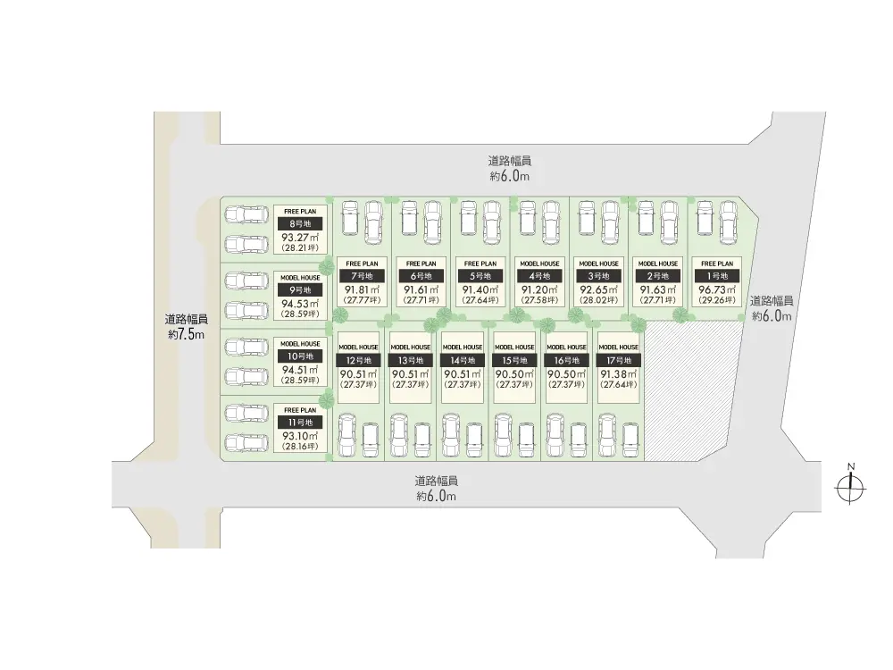 | 敷地面積 | 3号地:92.65㎡、4号地:91.20㎡、5号地:91.40㎡、7号地:91.81㎡、8号地:93.27㎡、9号地:94.53㎡、10号地:94.51㎡ |