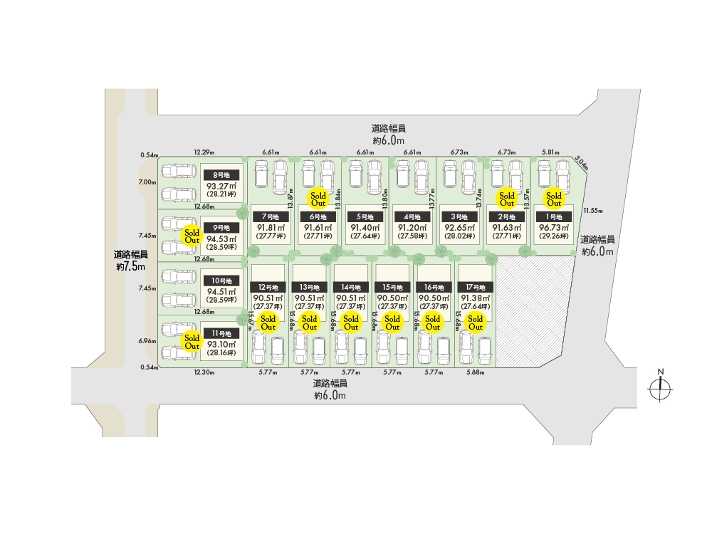 | 敷地面積 | 3号地:92.65㎡、4号地:91.20㎡、5号地:91.40㎡、7号地:91.81㎡、8号地:93.27㎡、10号地:94.51㎡ |