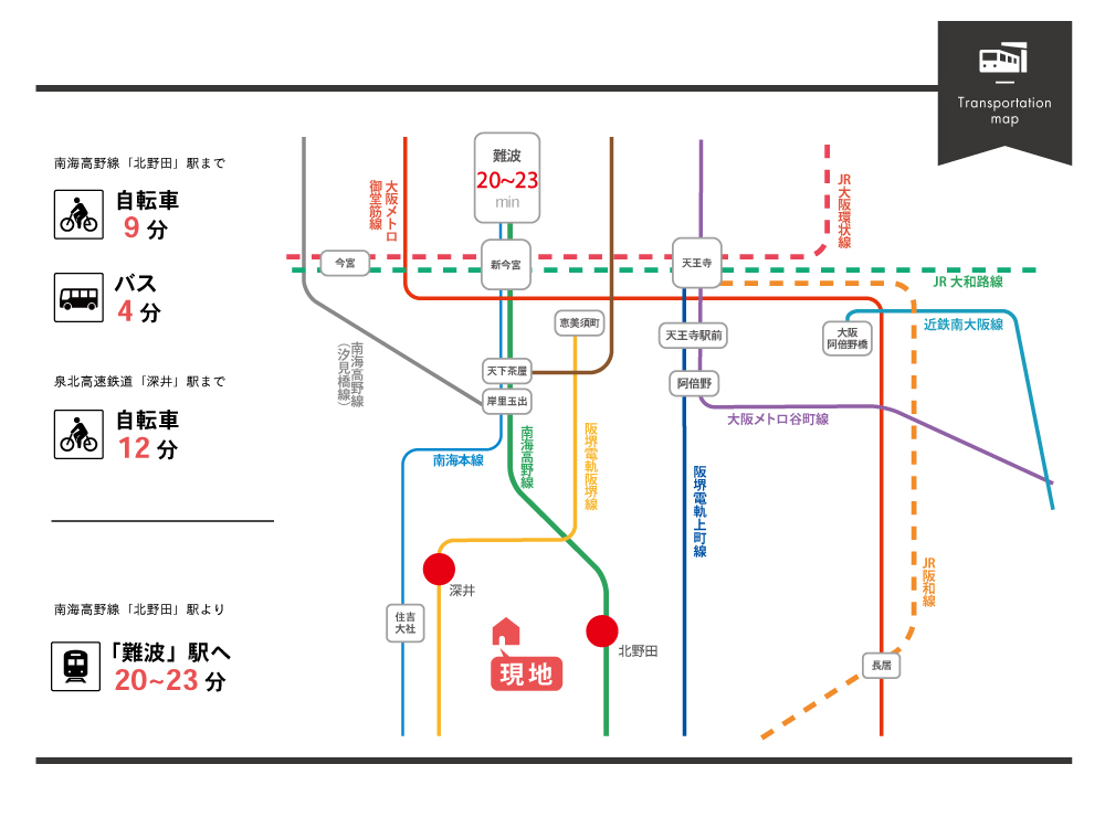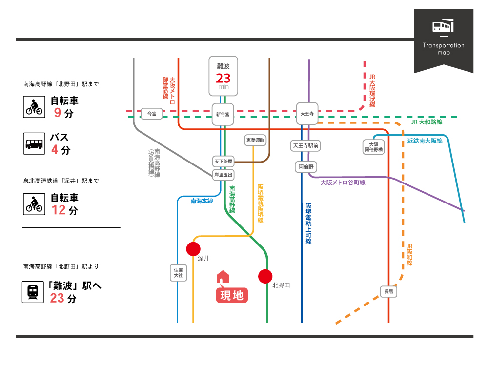 | その他交通 | 南海泉北線「深井」駅 自転車12分(2800m) 南海バス「下出口(堺)」停 徒歩5分、南海高野線「北野田」駅 バス4分 |