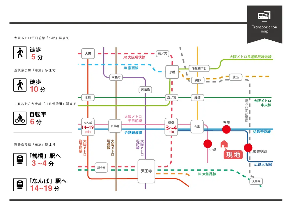 | その他交通 | 近鉄奈良線「布施」駅 徒歩10分 JRおおさか東線「俊徳道」駅 自転車6分(1300m) |