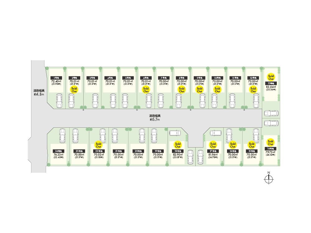 | 敷地面積 | 1号地:72.40㎡、3号地:70.01㎡、4号地:70.01㎡、5号地:70.01㎡、7号地:70.00㎡、11号地:70.00㎡、19号地:70.00㎡、20号地:70.00㎡、21号地:70.00㎡、23号地:70.00㎡、24号地:74.23㎡ |