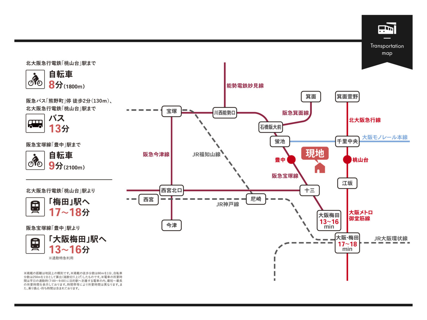 | その他交通 | 阪急バス「熊野町」停 徒歩2分(130m) 「桃山台」駅まで乗車13分・「豊中」駅まで乗車23分 |