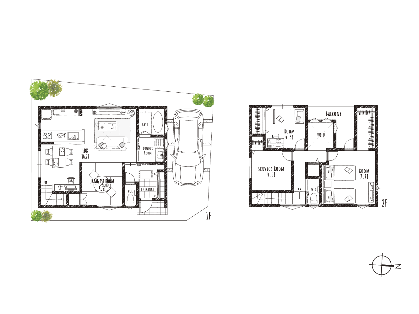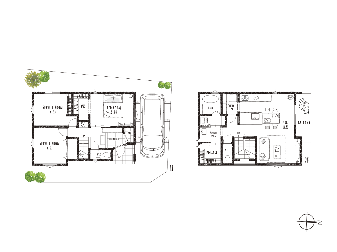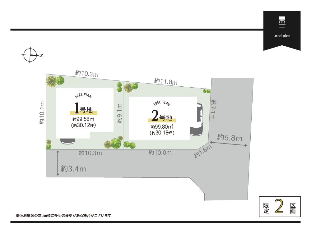 | 敷地面積 | 1号地/約99.58㎡(約30.12坪) 2号地/約99.80㎡(約30.18坪) |