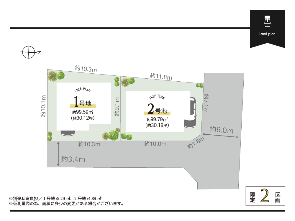 | 敷地面積 | 1号地/約99.59㎡(約30.12坪) 2号地/約99.79㎡(約30.18坪) |