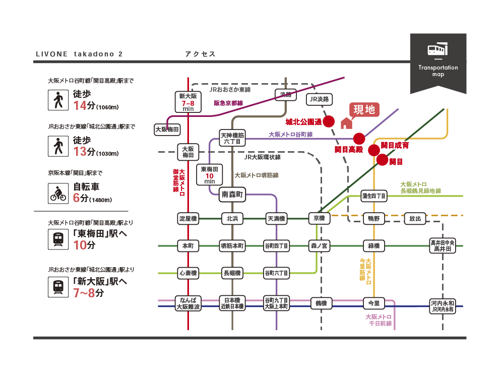 | その他交通 | JRおおさか東線「城北公園通」駅 徒歩13分(1030m) 京阪本線「関目」駅 自転車6分(1480m) |