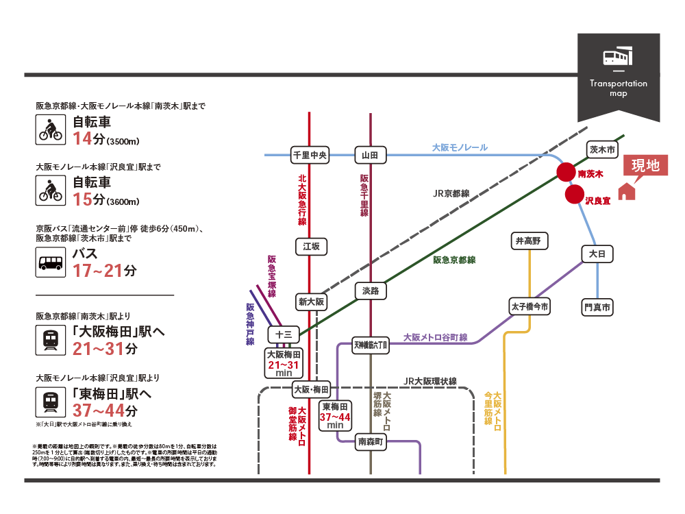 | その他交通 | 大阪モノレール本線「沢良宜」駅 自転車15分(3600m) 京阪バス「流通センター前」停 徒歩6分(450m)、 阪急京都線「茨木市」駅 バス17~21分 |