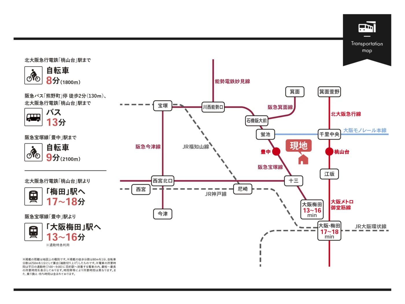 | その他交通 | 阪急宝塚線「豊中」駅 自転車9分(2100・2110m) 阪急バス「熊野町」停 徒歩2分(130・140m)、 「桃山台」駅まで乗車13分・「豊中」駅まで乗車23分 |